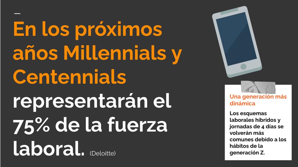 - El balance entre tiempo de entrega tendrá que ser menos considerado y enfocarse a metas, rendimiento y esfuerzo, ya que los centennials han aprendido a aprovechar la tecnología para optimizar tareas, por lo que tienen ventajas frente a las generaciones que les anteceden.