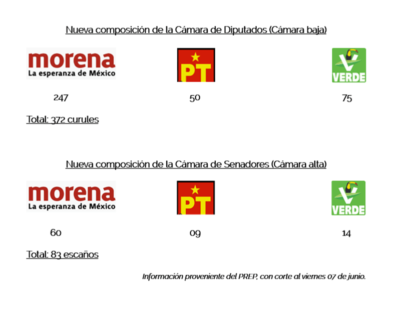 Tras los virtuales resultados de las pasadas elecciones, MORENA y sus aliados logran lo anterior, ya que obtuvieron más de dos tercios de la Cámara de Diputados (Cámara baja) y se quedaron solo a dos senadores de conseguir la mayoría calificada en la Cámara de Senadores (Cámara alta).