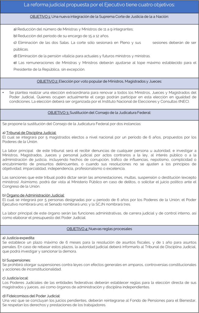 - Los jueces, magistrados y ministros del Poder Judicial, en vez de ser propuestos por el Ejecutivo y nombrados por legisladores, serán electos de manera directa por el pueblo.