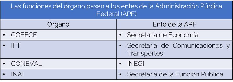 ¿El motivo de su desaparición? El presidente alega que el presupuesto total otorgado a estos organismos entre 2018 y 2024 equivale a más de cinco millones de pensiones bimestrales para el bienestar de personas adultas mayores, ya que la suma asciende a 32,300 millones de pesos asignados en este sexenio a los organismos enlistados. Asimismo, también argumenta que los cambios constitucionales convierten a estos órganos en inoperantes ya que sus funciones pueden ser asumidas por áreas de la Administración Pública Federal, por ejemplo, las funciones pasarían a: